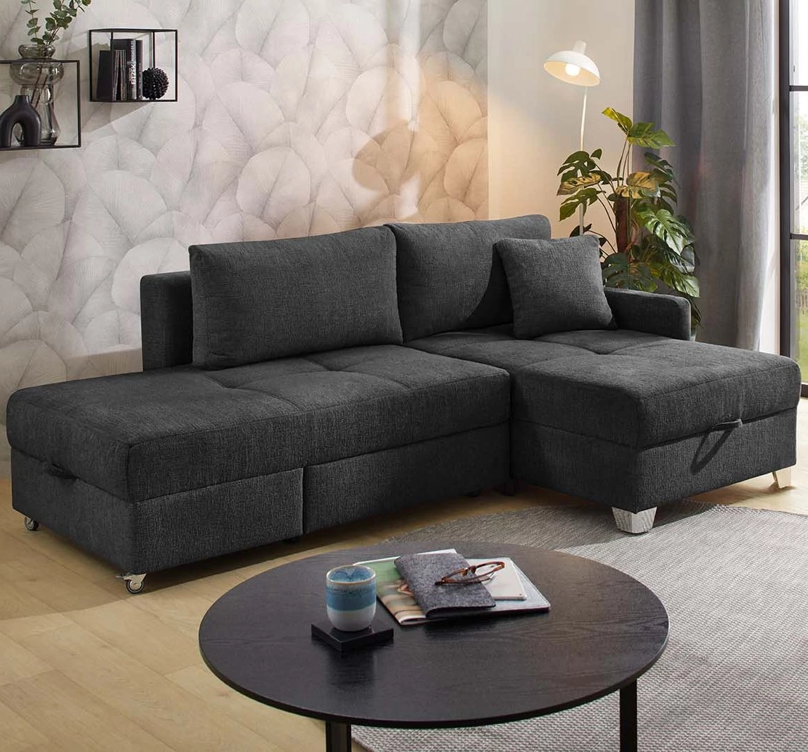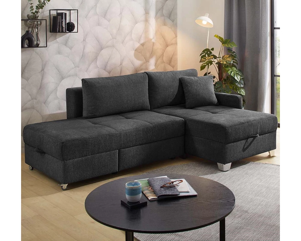 Van egy praktikus tárolódoboz is a takaróknak, párnáknak vagy egyéb tárgyaknak. A hullámos habszivacs bélés kiváló ülési és fekvési kényelmet biztosít. A valódi szövettel kárpitozott háttámlának köszönhetően ez az elegáns sarokkanapé a szobában bárhol elhelyezhető.