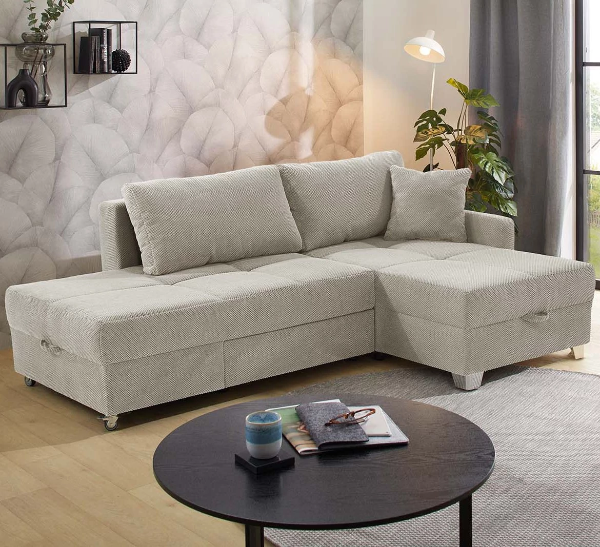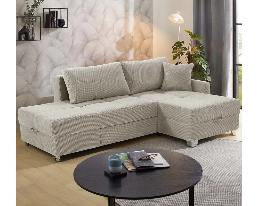 Van egy praktikus tárolódoboz is a takaróknak, párnáknak vagy egyéb tárgyaknak. A hullámos habszivacs bélés kiváló ülési és fekvési kényelmet biztosít. A valódi szövettel kárpitozott háttámlának köszönhetően ez az elegáns sarokkanapé a szobában bárhol elhelyezhető.