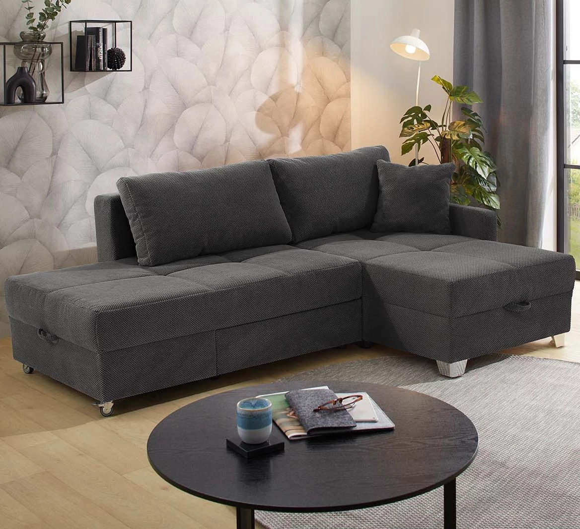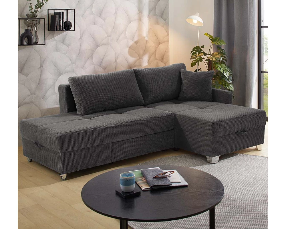 Van egy praktikus tárolódoboz is a takaróknak, párnáknak vagy egyéb tárgyaknak. A hullámos habszivacs bélés kiváló ülési és fekvési kényelmet biztosít. A valódi szövettel kárpitozott háttámlának köszönhetően ez az elegáns sarokkanapé a szobában bárhol elhelyezhető.